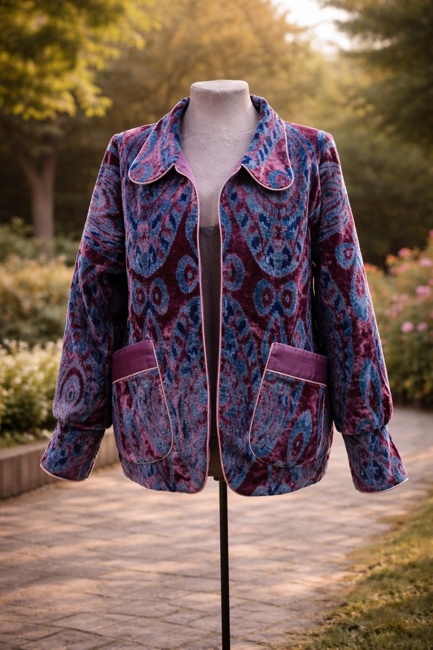 This oversized women’s ikat jacket is a handcrafted short coat featuring bold traditional Uzbek patterns in rich burgundy and blue tones. The design blends ethnic heritage with modern tailoring, creating a stylish and eye-catching outerwear piece.