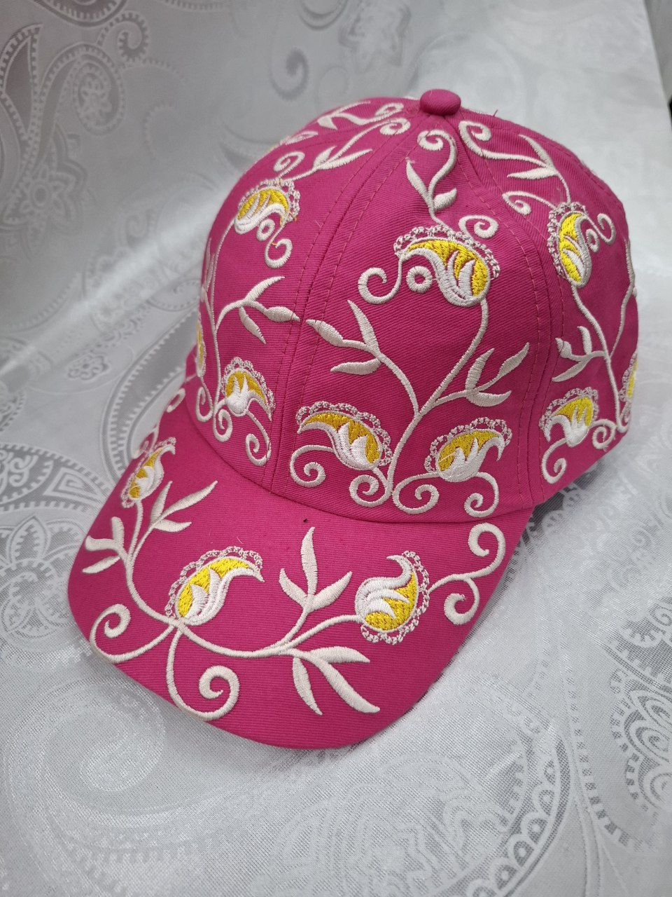 This pink Uzbek embroidered cap is a vibrant and stylish accessory that combines traditional craftsmanship with modern fashion. Made from high-quality fabric, it features elegant white and yellow floral embroidery inspired by authentic Central Asian ornamental patterns.