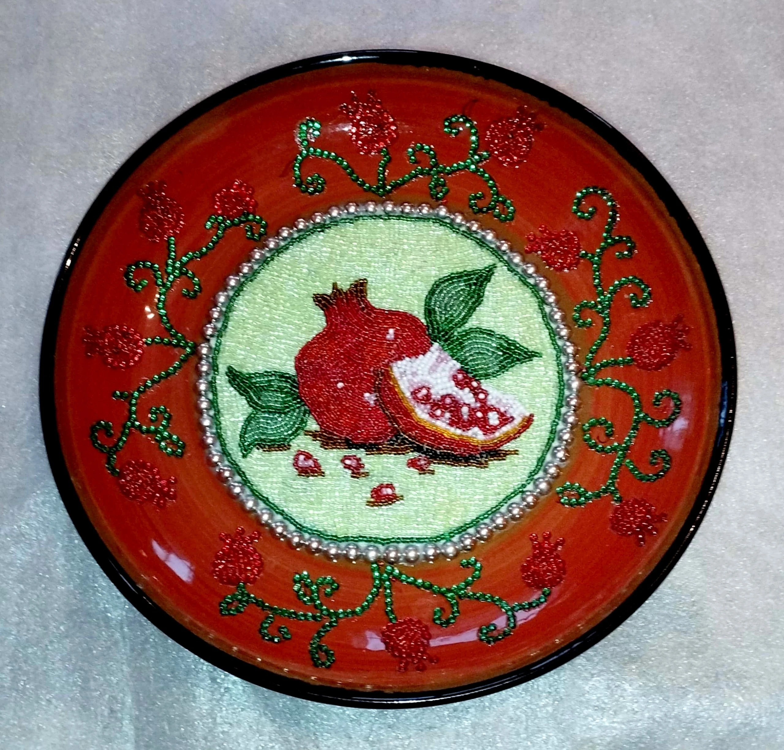 The plate features a pomegranate design and measures 32 cm. It is crafted from ceramic, beads, a needle, thread, and bo'z fabric.