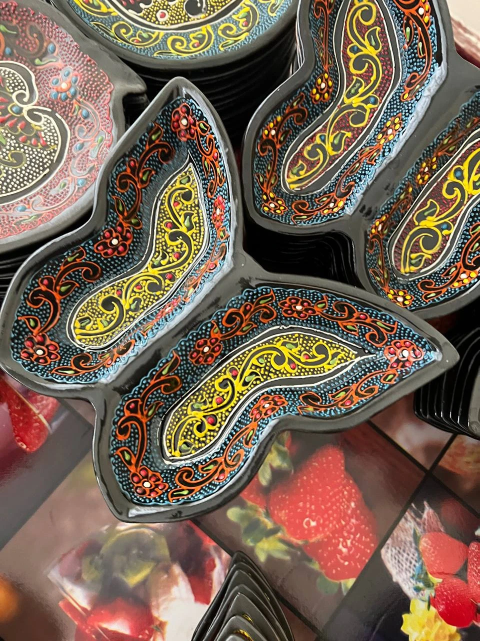 Uzbek Hand-Painted Ceramic Plate & Set – Product Description The images feature authentic handcrafted Uzbek ceramic plates and decorative serving sets, produced by skilled local artisans. Each piece showcases traditional Uzbek ethnic ornamentation, combining cultural symbolism with premium artistic detail. Design & Pattern Features Art style: Traditional Uzbek ceramic craftsmanship Motifs include: Buta (Paisley) patterns representing elegance and prosperity Floral mandala compositions symbolizing harmony and continuity Islimi (curved vine ornaments) inspired by nature Symmetrical geometric star and segment layouts Technique: hand-painted dotwork (nuqta naqsh) and fine contour ornament painting Finish: glossy protective glazed coating for long-lasting color and shine Unique detail: Some plates include hand-written cultural text such as “Tashkent” or “Uzbekistan”, adding heritage identity Materials & Craftsmanship Material: 100% natural ceramic clay Production: fully hand-molded and hand-painted Texture & look: dense dotted ornament background for a premium artisanal aesthetic Uniqueness: Every plate is one-of-a-kind, with slight natural variations due to handmade art Best Use Cases Decorative wall or table display Dry serving for sweets, dried fruits, nuts, or snacks Cultural interior styling for cafés, hotels, galleries, offices, and craft shops Premium heritage gift for local and international audiences Value & Audience Appeal These ceramic plates reflect the rich artistic heritage of Uzbekistan, emphasizing authenticity, symmetry, and vibrant handmade detailing — perfect for customers who appreciate cultural craftsmanship, ethnic décor, and premium artisanal tableware.
