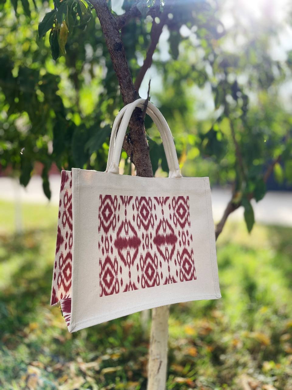 This elegant handmade tote bag features a natural beige fabric base decorated with traditional red ikat-style patterns on the front and sides. Crafted from durable textile material, it offers both strength and a stylish ethnic look.