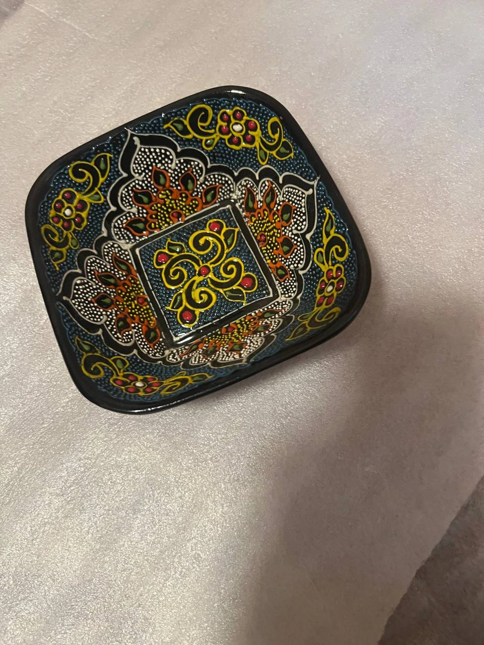 Handcrafted ceramic collection inspired by Uzbek traditional art. Each piece is carefully decorated with intricate oriental patterns, floral motifs, and vibrant color accents created using a dotted relief painting technique. The glossy black finish highlights the rich contrast of turquoise, gold, red, and green decorative details, making every item a unique work of craftsmanship. These ceramics are made from high-quality clay, shaped with precision, and finished by skilled artisans. The artistic design reflects cultural heritage and brings an elegant, timeless aesthetic suitable for both home décor and functional use. Every piece carries a handmade charm, ensuring no two items are exactly the same. A perfect blend of tradition, art, and practicality—crafted to add warmth, beauty, and authenticity to any space.