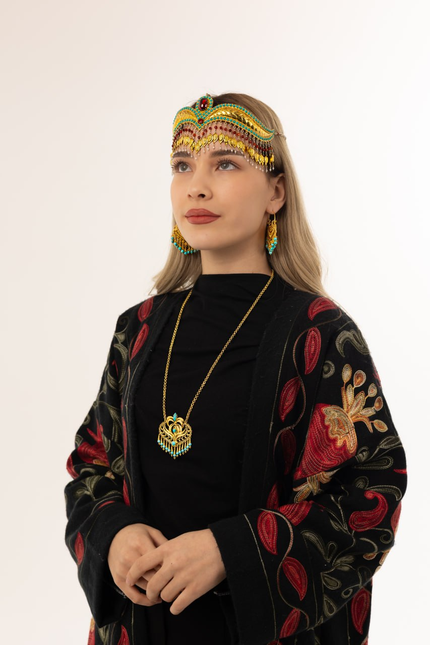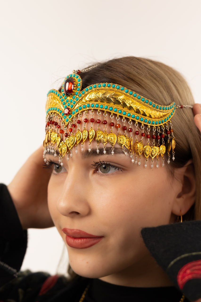 This traditional Tilla Kosh headpiece is a stunning example of Uzbek cultural jewelry, crafted with intricate details and rich decorative elements. Featuring gold-tone metal, turquoise accents, and delicate hanging ornaments, it creates a regal and elegant look.