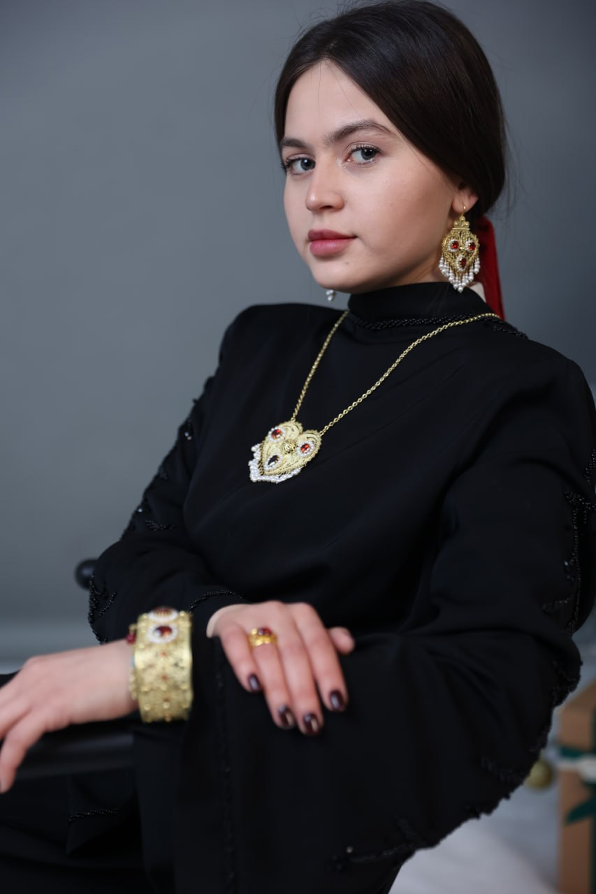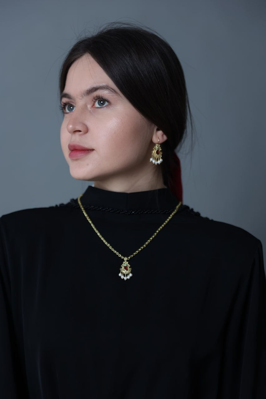 Elevate your style with this elegant Uzbek jewelry set featuring matching earrings and pendant, inspired by traditional Central Asian craftsmanship. Designed with intricate gold-tone detailing, rich red stones, and delicate pearl accents, this set reflects timeless heritage and artisan beauty.