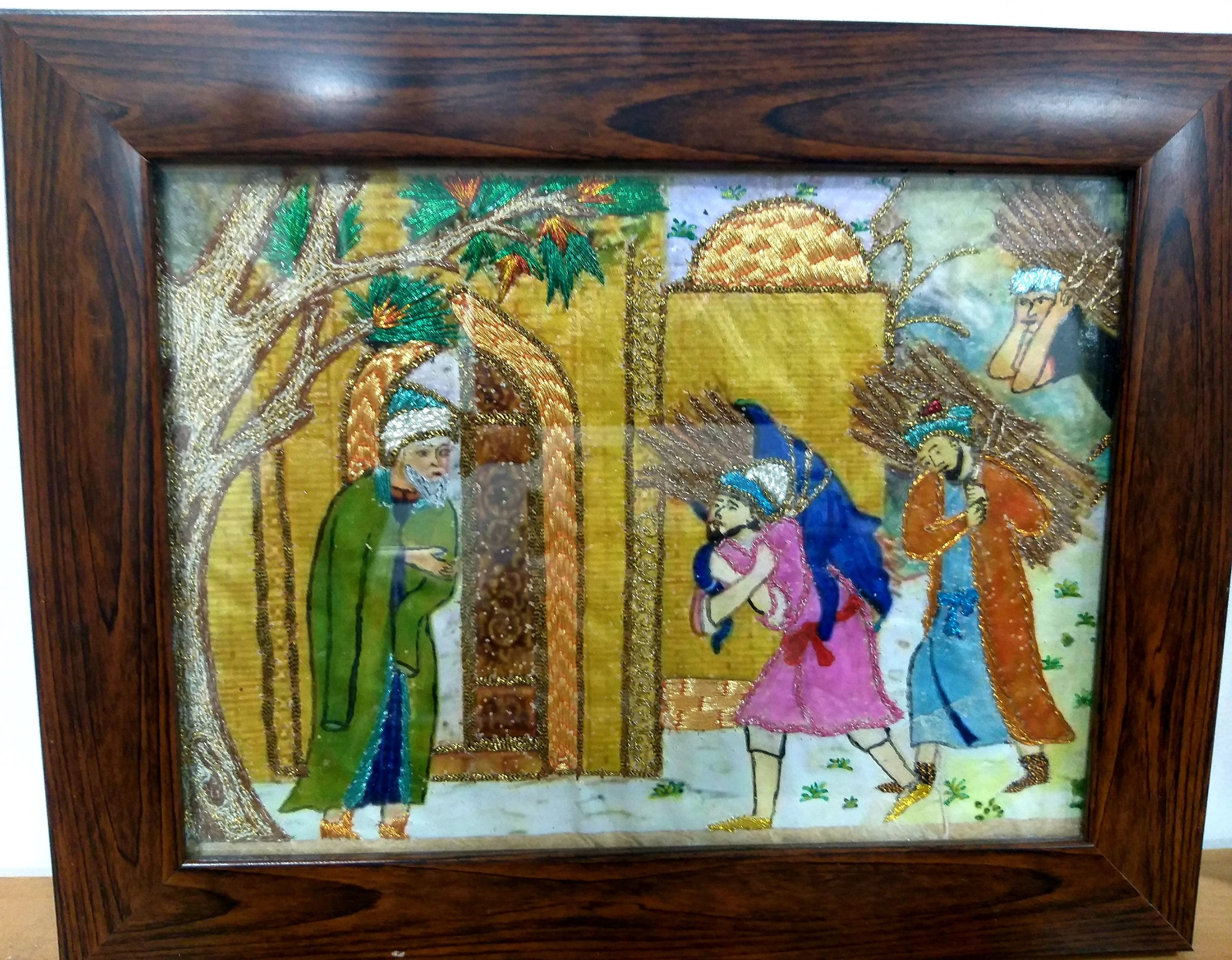 This is a 100% handmade and hand-painted artwork crafted in the Uzbek traditional miniature art style, featuring a meaningful cultural and family-oriented scene. The painting portrays several human figures wearing classic Central Asian garments, including long cultural robes, traditional head wraps, and atlas/adras-inspired textile patterns. The central composition shows a young horse rider dressed in a pink traditional robe, accompanied by other travelers or family members, symbolizing journey, unity, and heritage storytelling. The background includes traditional architectural elements, nature illustrations, and subtle decorative details enhanced with hand-applied golden paint accents, giving the artwork a vintage and cultural aesthetic. The painting is protected behind clear glass and framed with a rectangular dark wooden polished frame, ensuring durability and long-term preservation. The natural, slightly irregular edges of the artwork emphasize its artisanal and handcrafted origin. Art Highlights: 100% handmade and hand-painted; Uzbek and Central Asian miniature art theme; Cultural robes and textile-inspired traditional patterns; Golden hand-brush detailing; Glass-protected rectangular wooden frame; Suitable for wall decor, heritage spaces, art collections, and cultural gifting; Appeals to both youth and adult audiences. This artwork is ideal for those who appreciate national heritage, handcrafted art, cultural storytelling, and traditional interior design.