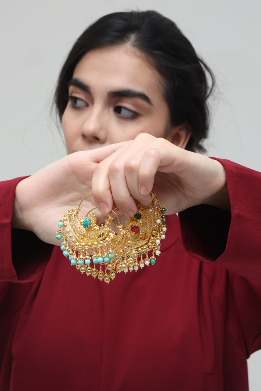 Featuring a rich ornamental structure with layered details and moving elements, these statement earrings create a graceful and eye-catching look. The mix of turquoise and gemstone accents adds vibrant color, making them perfect for weddings, special occasions, and traditional celebrations.