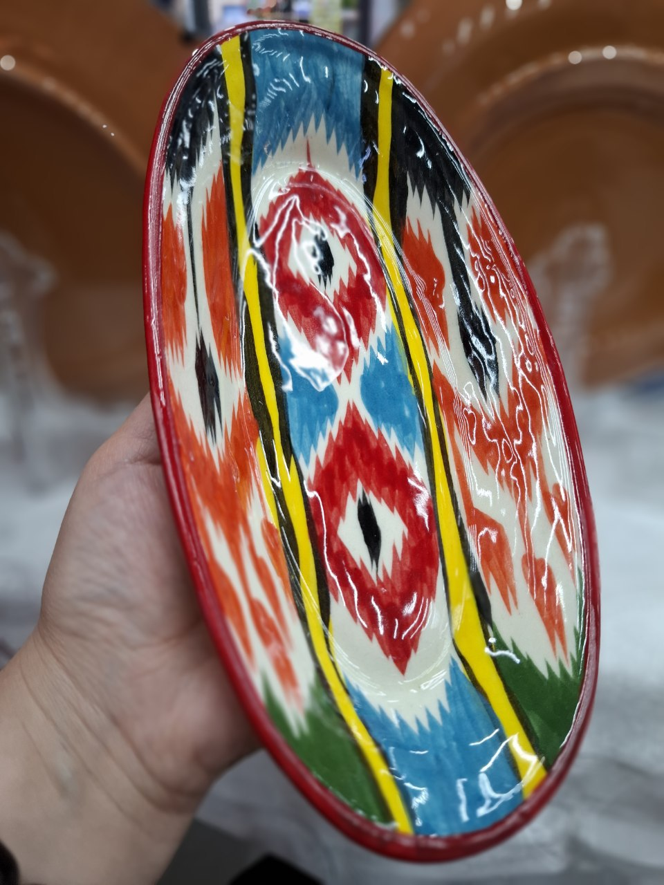 This stunning oval ceramic plate features a traditional ikat pattern, showcasing rich multicolor tones including: