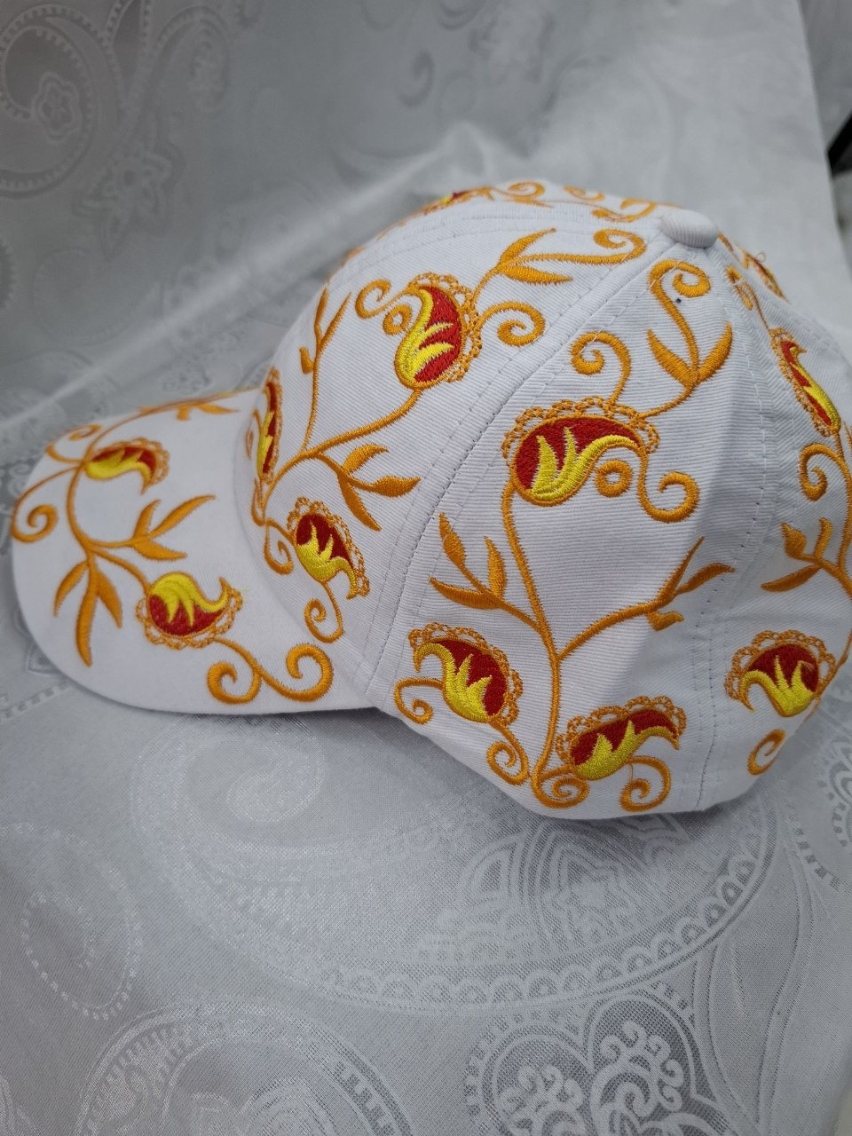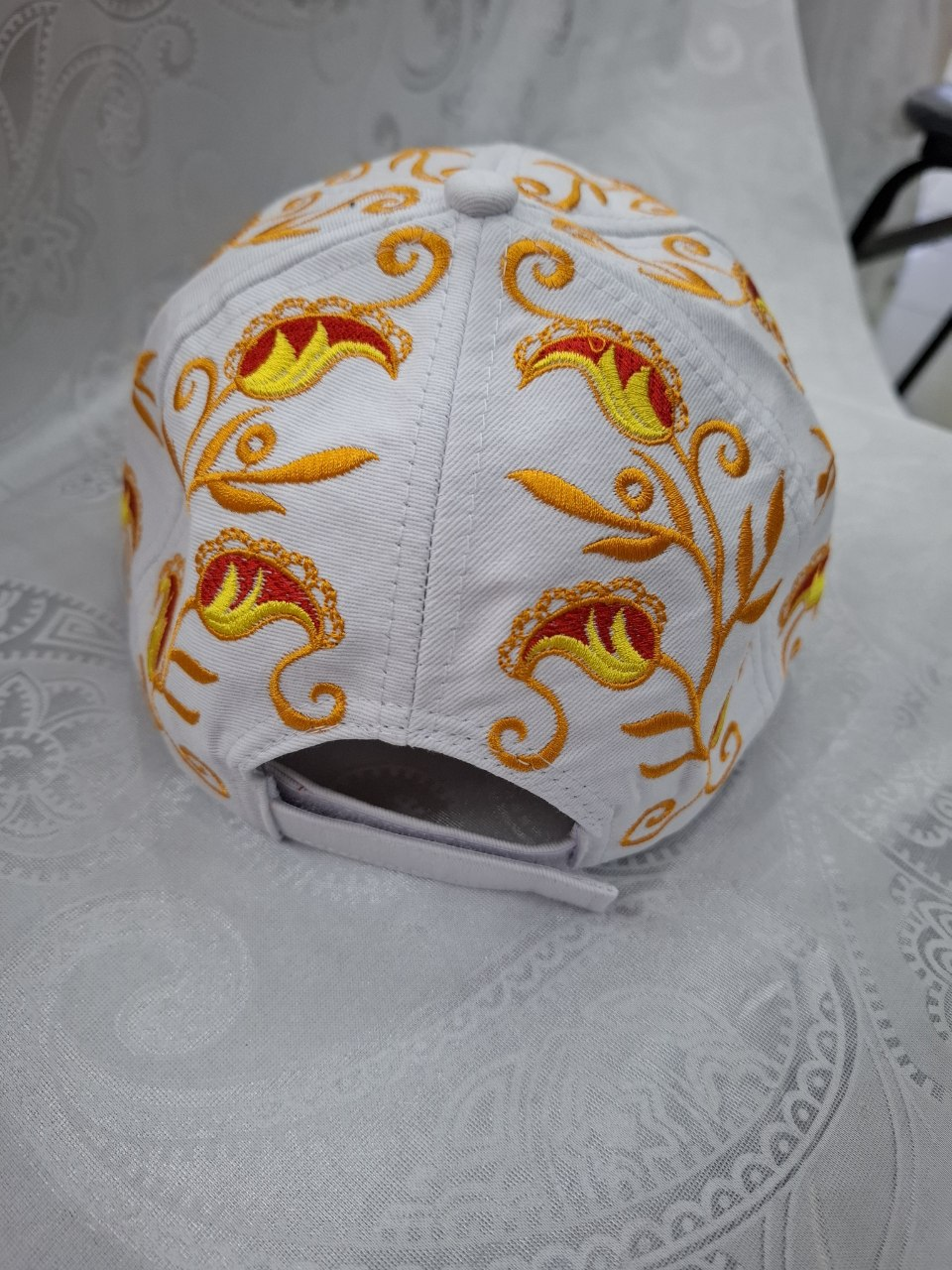 The bright design stands out against the clean white base, creating a fresh and elegant look. With its adjustable snapback closure, the cap ensures a comfortable fit for everyday wear. The detailed embroidery adds a cultural touch, making it more than just a hat — it’s a statement of heritage and style.