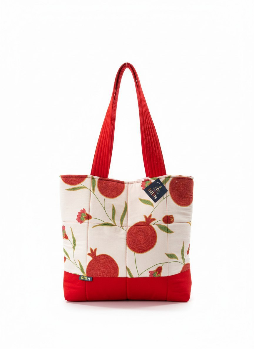 A stylish quilted women’s bag made from cotton satin fabric. The bag features large quilted stitching with a polyester layer placed between two layers of fabric, giving it structure, softness, and durability. The cotton thread stitching and cotton-satin lining provide comfort and quality, making it suitable for everyday use.