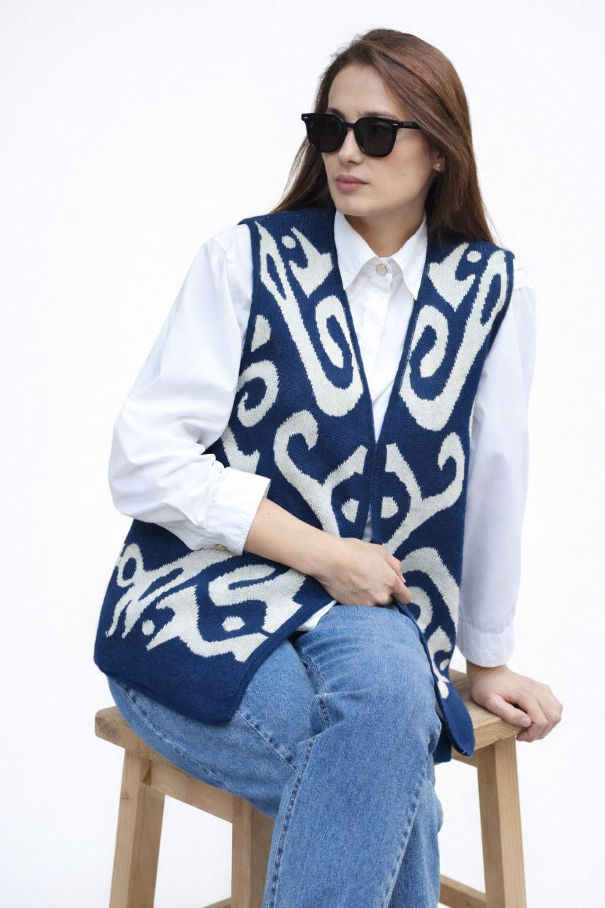 This women’s ikat vest is a stylish handmade piece inspired by traditional Uzbek patterns. Featuring a bold blue and white ikat design, this sleeveless knit vest combines cultural heritage with modern fashion, making it a versatile addition to any wardrobe.